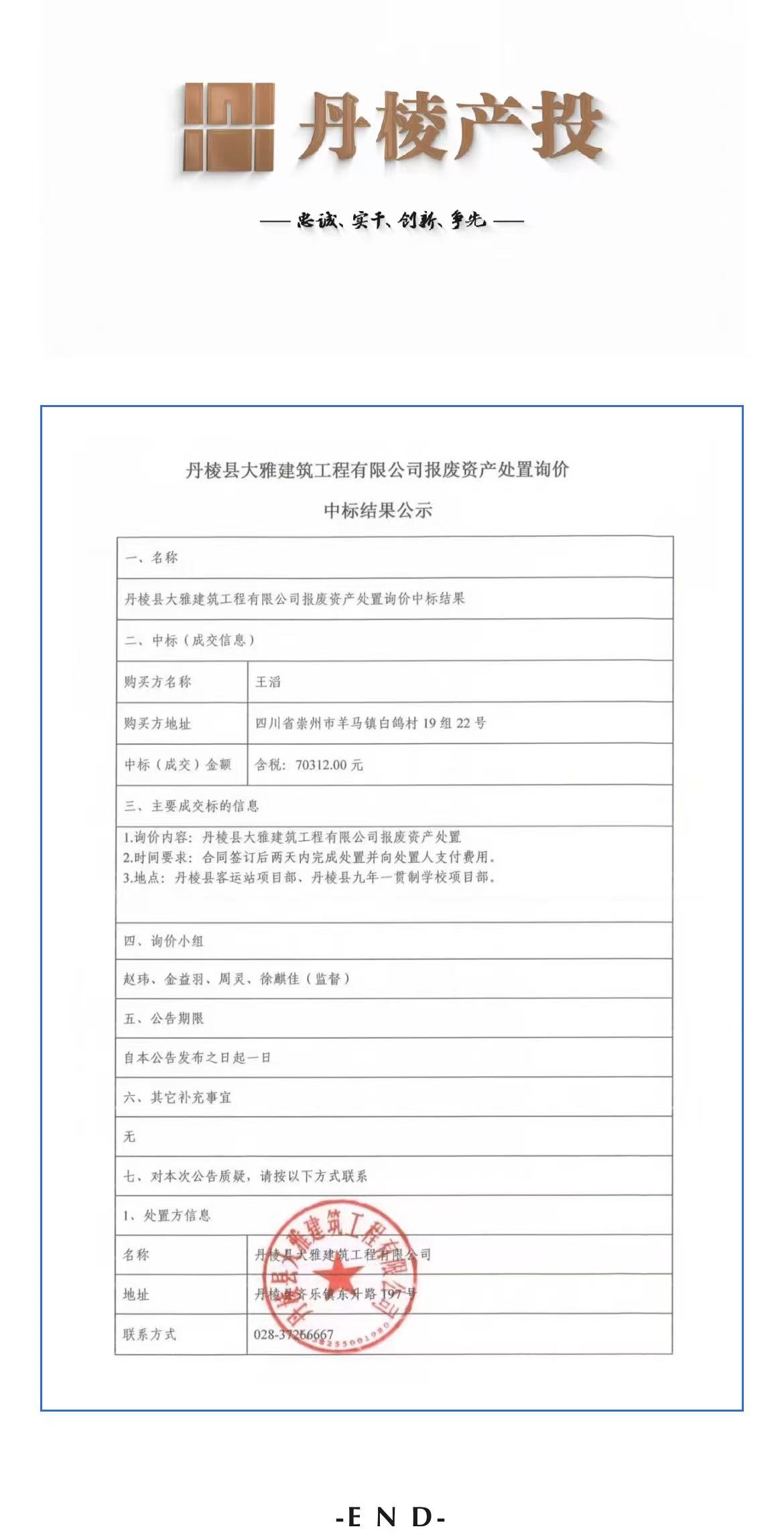 丹棱縣大雅建筑工程有限公司報廢資產(chǎn)處置詢(xún)價(jià)中標結果公示